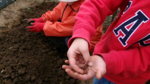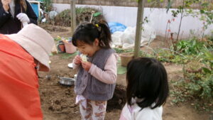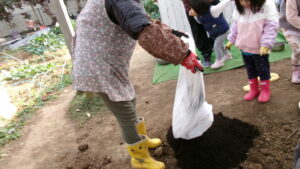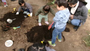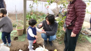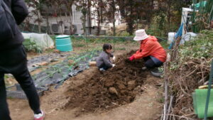 スタッフが 土をほぐしていると…               お喋りしながら お手伝いかな?